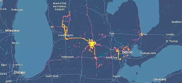 Cellphone data shows 300 of the people who had gathered in Lansing for "Operation Gridlock" scattered throughout the state after the protest. The color of the dot represents device activity: yellow is more activity, red is lighter.